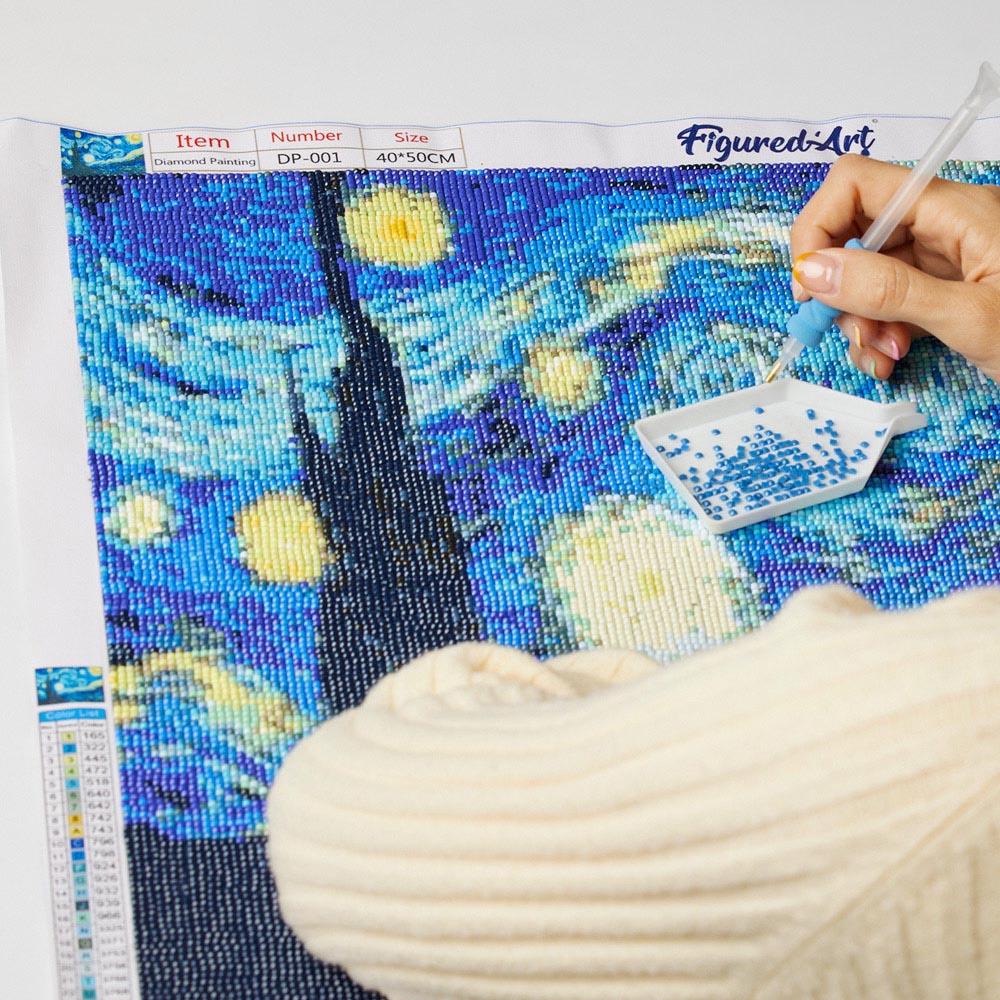 Sparkle your way to a masterpiece. The Figured’Art Diamond Painting Kit turns a 16"x20" canvas into dazzling wall art, covered entirely with shimmering square diamonds. Relax, follow the simple steps, and enjoy the satisfaction of creating your own sparkling décor piece.