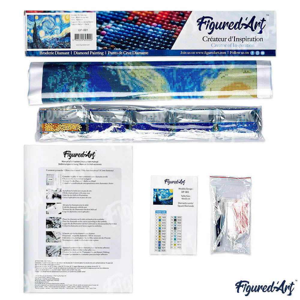 Sparkle your way to a masterpiece. The Figured’Art Diamond Painting Kit turns a 16"x20" canvas into dazzling wall art, covered entirely with shimmering square diamonds. Relax, follow the simple steps, and enjoy the satisfaction of creating your own sparkling décor piece.